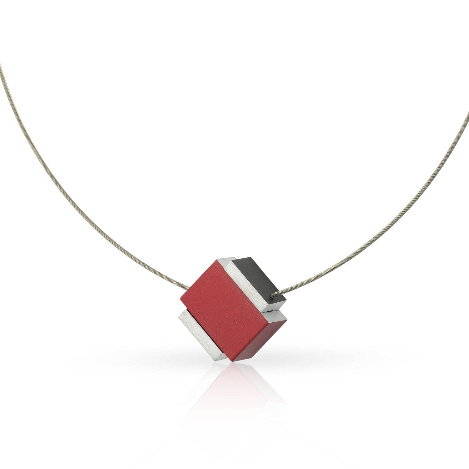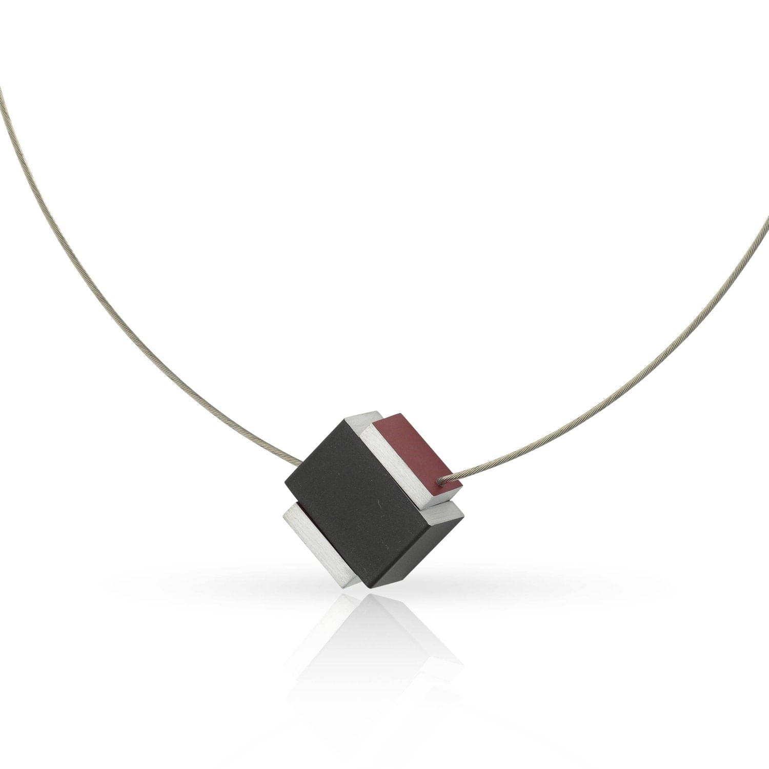 A necklace that goes with every outfit and subtly stands out. The necklace falls in a V-shape. Necklace of an open square with a closed square with magnetic closure placed in it. The magnets attract each other and with a "clic" this necklace closes. This necklace opens by removing the cube from the square. The necklace is provided with a smoothly falling stainless steel necklace wire, matte and high-gloss finished. You can endlessly combine this necklace with other matte and shiny silver-colored items from our collection. Timeless and basic in design.